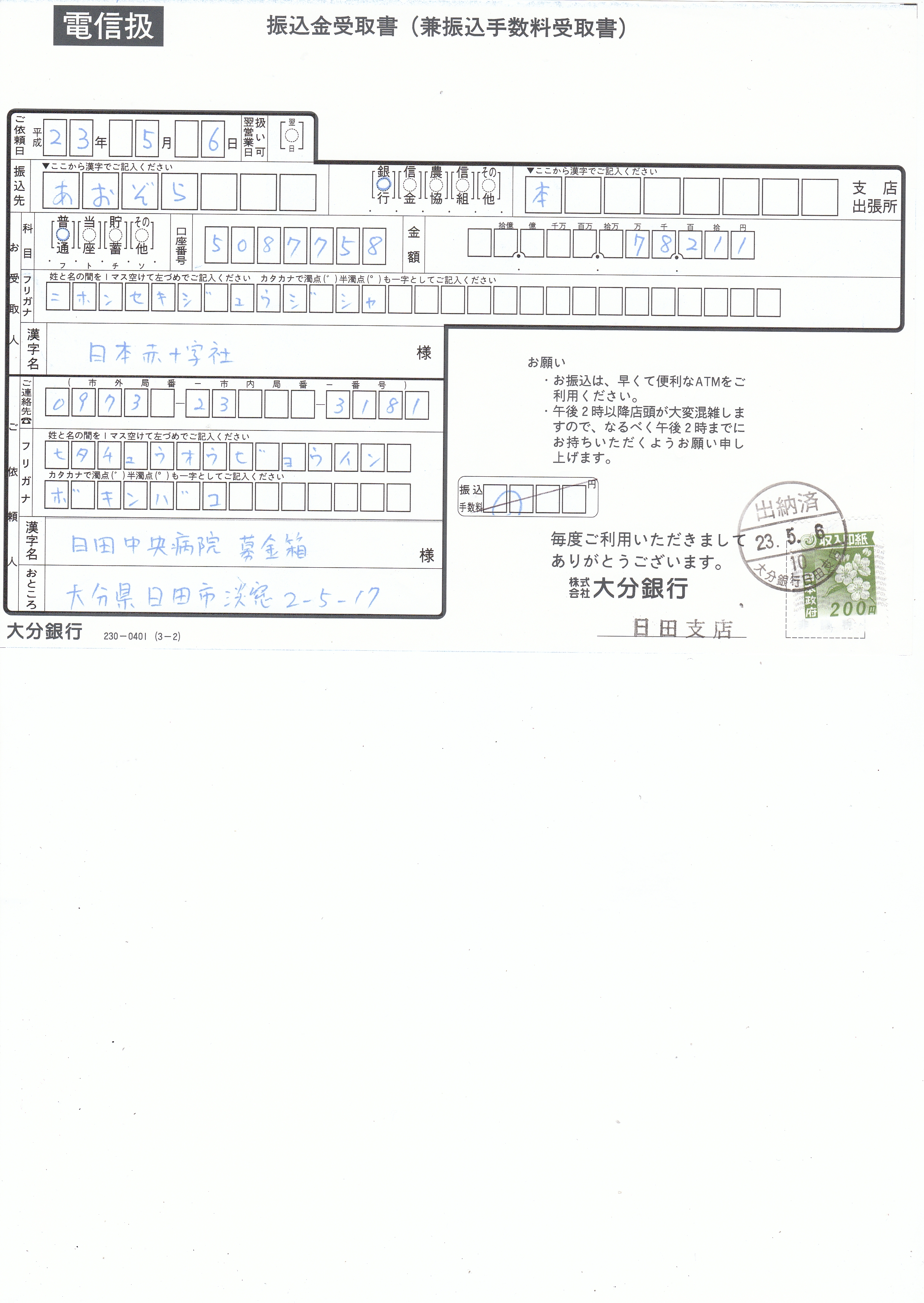 上記金額は、日本赤十字社に振り込み致しました。