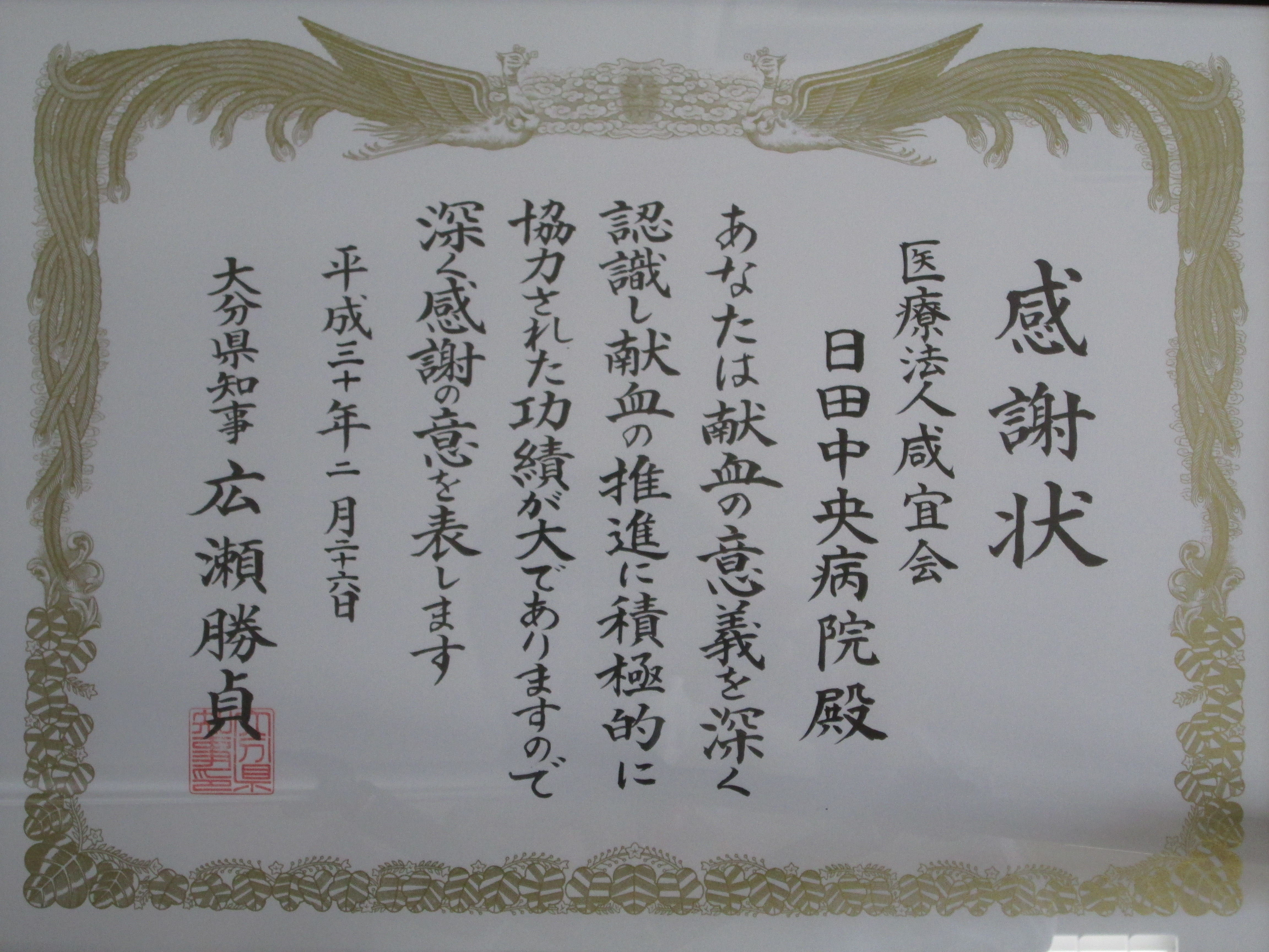 皆様のご協力をいただき行って参りました献血活動が評価され、この度大分県知事から